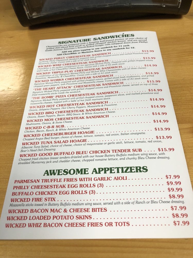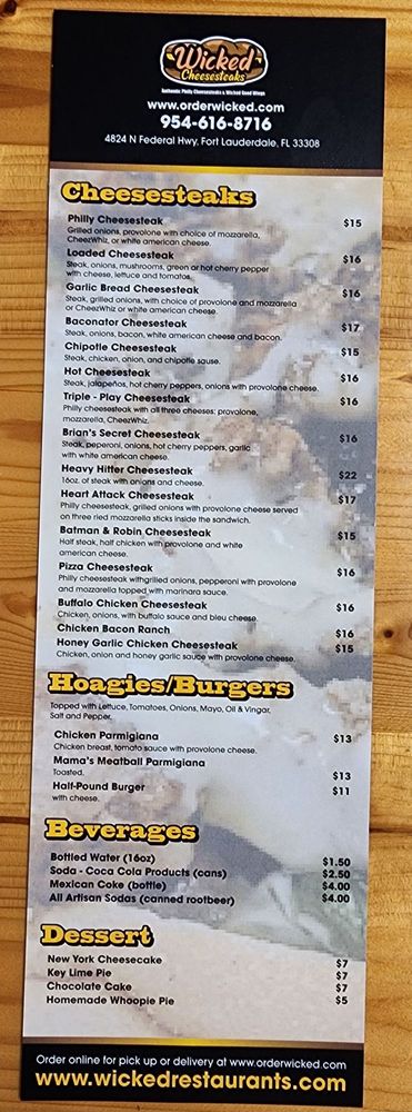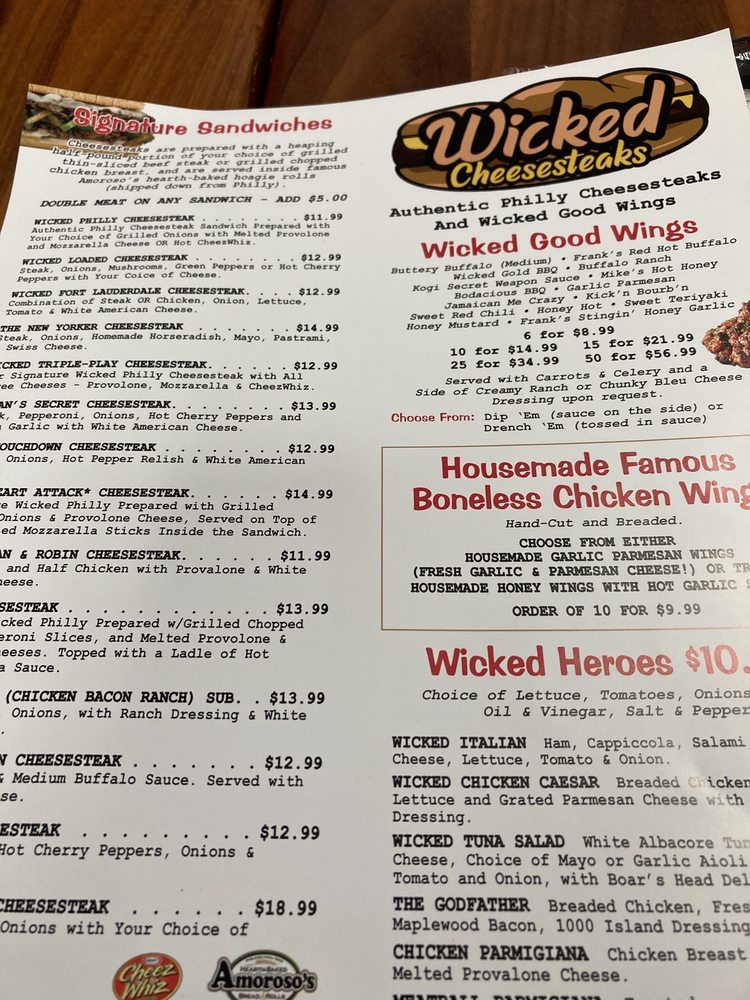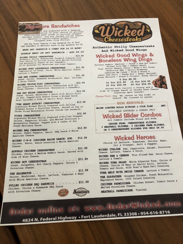 Introducing the menu at Wicked Cheesesteaks Pizza & Wings, located in Fort Lauderdale, FL, where you can enjoy a variety of delicious options including cheesesteaks, pizza, and sandwiches. Specials like the 16" Large Cheese Pizza and 6 Wings & Fries showcase the high quality ingredients and homemade flavors. Indulge in specialty sandwiches like the 2 Sliders with French Fries and Brian's Secret Cheesesteak. The Signature Cheesesteaks, such as Batman and Robin Philly and CBR Chicken Bacon Ranch Cheesesteak, offer unique twists on classic favorites. With options for vegetarians and a range of amenities like delivery, takeout, and catering, Wicked Cheesesteaks Pizza & Wings is a must-visit for those craving hearty and satisfying meals. Whether you're dining in or grabbing food to go, this spot has something for everyone to enjoy.